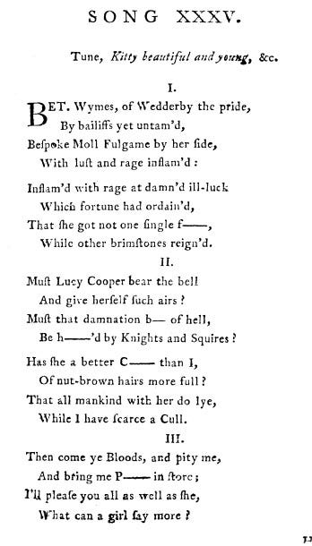 Readers will be relieved to note the final verse: ‘Her prayers were heard, the Bloods gave way, / She had her heart’s desire; / Obtained a P— that very day / Which set her C— on fire.’ Though quite whether, in the end, this use of Prick is ethereal rather than lumpen, I am loathe to wager.2 Cull, elsewhere a sucker, means, predictably, a whore’s client here and maybe Bet just wants some ready rhino.3