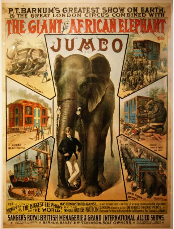 Once again I have the usual support from the incomparable Jim Gibbons and tip my titfer accordingly. His sources this quarter include the great American showman Phineas T. ‘Nobody ever lost a dollar by underestimating the taste of the American public’ Barnum, the man who brought the world Tom Thumb, Zip the Pinhead, Jo-Jo The Dog-Faced Boy and, after a stay at Regent’s Park Zoo in London, Jumbo the elephant. Barnum, of course, is well known, though I for one was not aware of his slang dimension (he is cited for 84 terms).