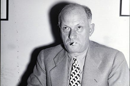 Unlike Mencken, an older contemporary and another glorious prose stylist (and trencherman), Liebling is rarely if ever cruel. He prefers the subtle implications of irony to Mencken’s brimstone savagery. His topics drew on what his hero Egan would have termed the ‘sporting’ world, which as well as actual sportsmen – jockeys, prizefighters, the ancillary world of both – meant that of gamblers and chancers of every hue, of criminals (mainly minor) and above all of those who, legitimately or otherwise, struggled to make a buck. His greatest creation – though the man was of flesh-and-blood, real name James Aloysius Macdonald – appeared in The Honest Rainmaker, subtitled ‘The Life and Times of Colonel John R Stingo’. Stingo was a racing tipster who lived in what he called a ‘one-room suite’ above a mid-town bus terminal. His life, at least as conveyed by Liebling, was an epic of tricksterdom, profitable or not.